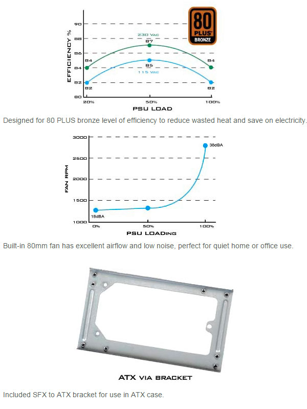 Connectors | 1 x 24 / 20-Pin motherboard connector(300mm) 1 x 8 / 4-Pin EPS / ATX 12V connector(400mm) 1 x 8/6-Pin PCIE connector(400mm) 1 x 6-Pin PCIE connector(400mm / 150mm) 3 x SATA connector(300mm / 220mm / 100mm) 2 x 4-Pin Peripheral connector (300mm / 200mm) 1 x 4-Pin Floppy connector(300mm / 200mm / 200mm) |