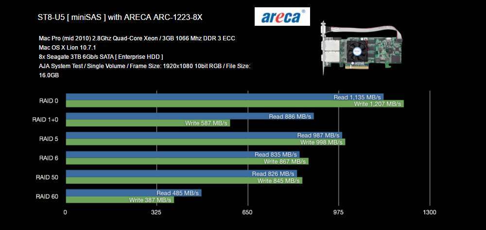 When used with the ATTO R680 PCIe x8 RAID controller a ST8-U5 with eight 7200 RPM, SATA II drives in RAID 5 protected mode achieves close to 1000MB/sec performance and supports two simultaneous streams of uncompressed 10-bit HD or a single 2K DPX sequence.