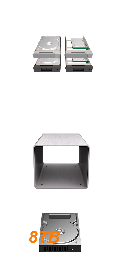 ST2 is compatible with all brands of 8TB SATA hard drives. Install two 8TB hard drives under RAID 0 mode and the system will provide 16TB of access. Independent JBOD mode can offer independent storage areas even if the hard drives are of different capacities.