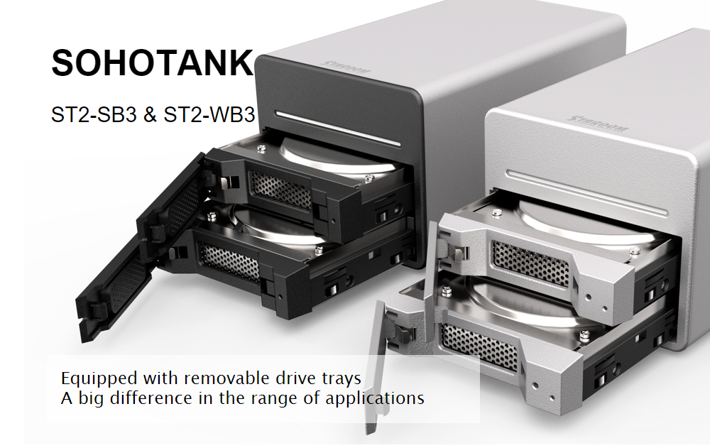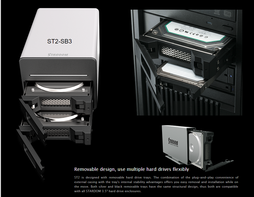 ST2 is designed with removable hard drive trays. The combination of the plug-and-play convenience of external casing with the tray's internal stability advantages offers you easy removal and installation while on the move. Both silver and black removable trays have the same structural design, thus both are compatible with all STARDOM 3.5" hard drive enclosures.
