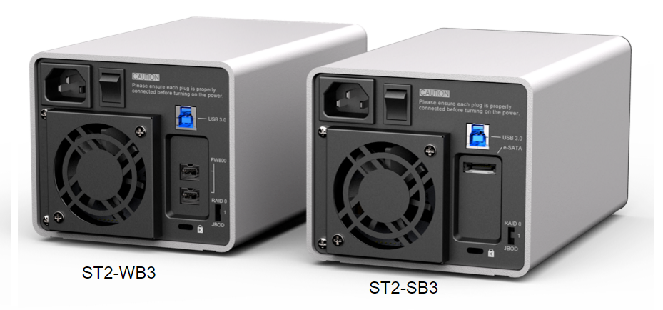 | Interfaces | Two Firewire 800 Ports USB 3.0 Port ( up to 5 Gbps ) | USB 3.0 Port ( up to 5 Gbps ) e-SATA Port ( up to 3 Gbps ) Before using the ST2-SB3 e-SATA port, make sure that the host supports the port multiplier function in order for system to identify all the drives. |